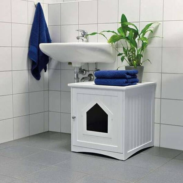 Das Katzenhaus aus weiß lackiertem MDF kann entweder als dekoratives Schlafhaus genutzt werden, oder besonders praktisch zum Verbergen der Katzentoilette.