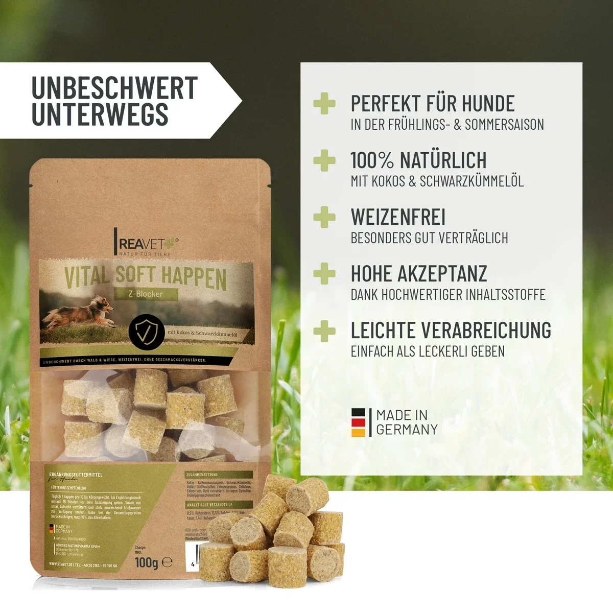 Unsere REAVET Vital Soft Happen Z-Blocker sind die idealen Begleiter auf Wald- & Wiesenspaziergängen und eignen sich hervorragend als schmackhafte Belohnung für Zwischendurch. Diese einzigartigen Leckerbissen sind nicht nur köstlich, sondern enthalten auch eine sorgfältig ausgewählte Mischung aus Schwarzkümmelöl und Kokos. Sie sind leicht verdaulich und werden aus besten Zutaten hergestellt, um eine optimale Verträglichkeit zu gewährleisten. Für eine bessere Verträglichkeit verzichten wir auf Weizen - deshalb eignet sich unser Z-Blocker Vital Soft Happen auch perfekt für Hunde mit Futtermittelallergien und Unverträglichkeiten.