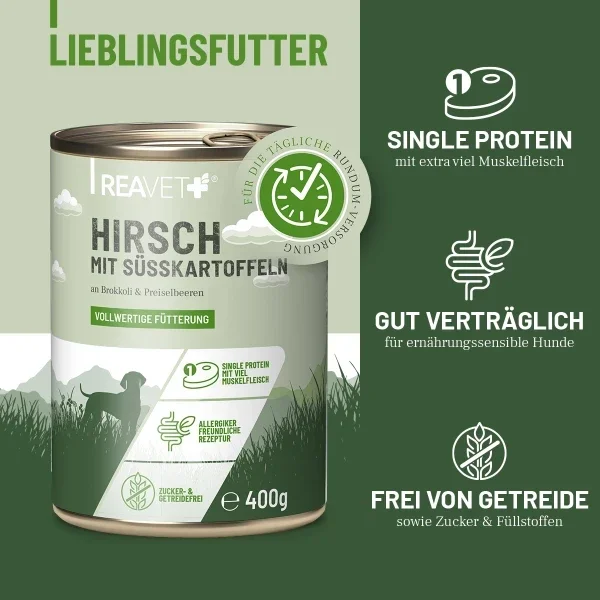 Hundenassfutter - Hirsch mit Süßkartoffel an Brokkoli & Preiselbeeren | 6 x 400g