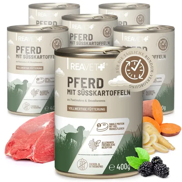 Hundenassfutter - Pferd mit Süßkartoffeln an Pastinaken & Brombeeren | 6 x 400g