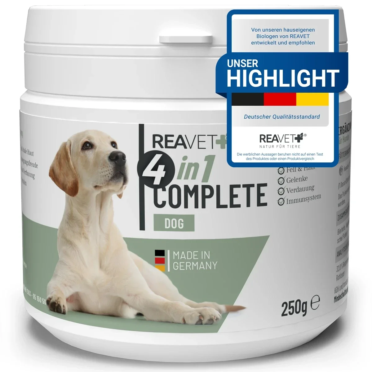 Schenke Deinem Hund Vitalität, Lebensfreude und Wohlbefinden – Tag für Tag. REAVET 4in1 Complete Dog vereint eine ausgewogene Kombination natürlicher Inhaltsstoffe und wurde für Hunde aller Altersstufen entwickelt. Ob junger Hund, Senior oder trächtige Hündin – die 4in1-Formel passt sich den individuellen Bedürfnissen Deines Vierbeiners an und ergänzt die tägliche Fütterung auf sinnvolle Weise. Auch bei BARF-Ernährung ist sie ideal einsetzbar.