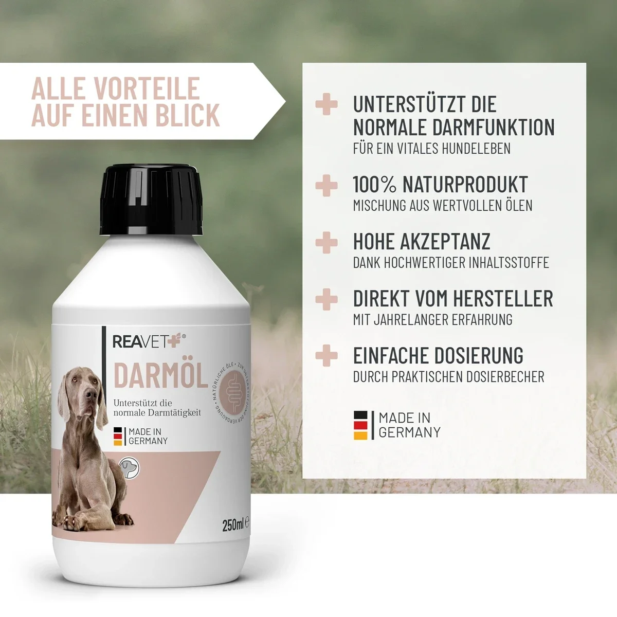 REAVET Darmöl für Hunde ist eine hochwertige Mischung aus natürlichen Ölen zur Unterstützung der Verdauung Deines Hundes. Das Darmöl kann problemlos unter das normale Futter Deines Hundes gemischt werden. Es ist frei von synthetischen Zusatzstoffen und überzeugt durch eine hohe Akzeptanz.