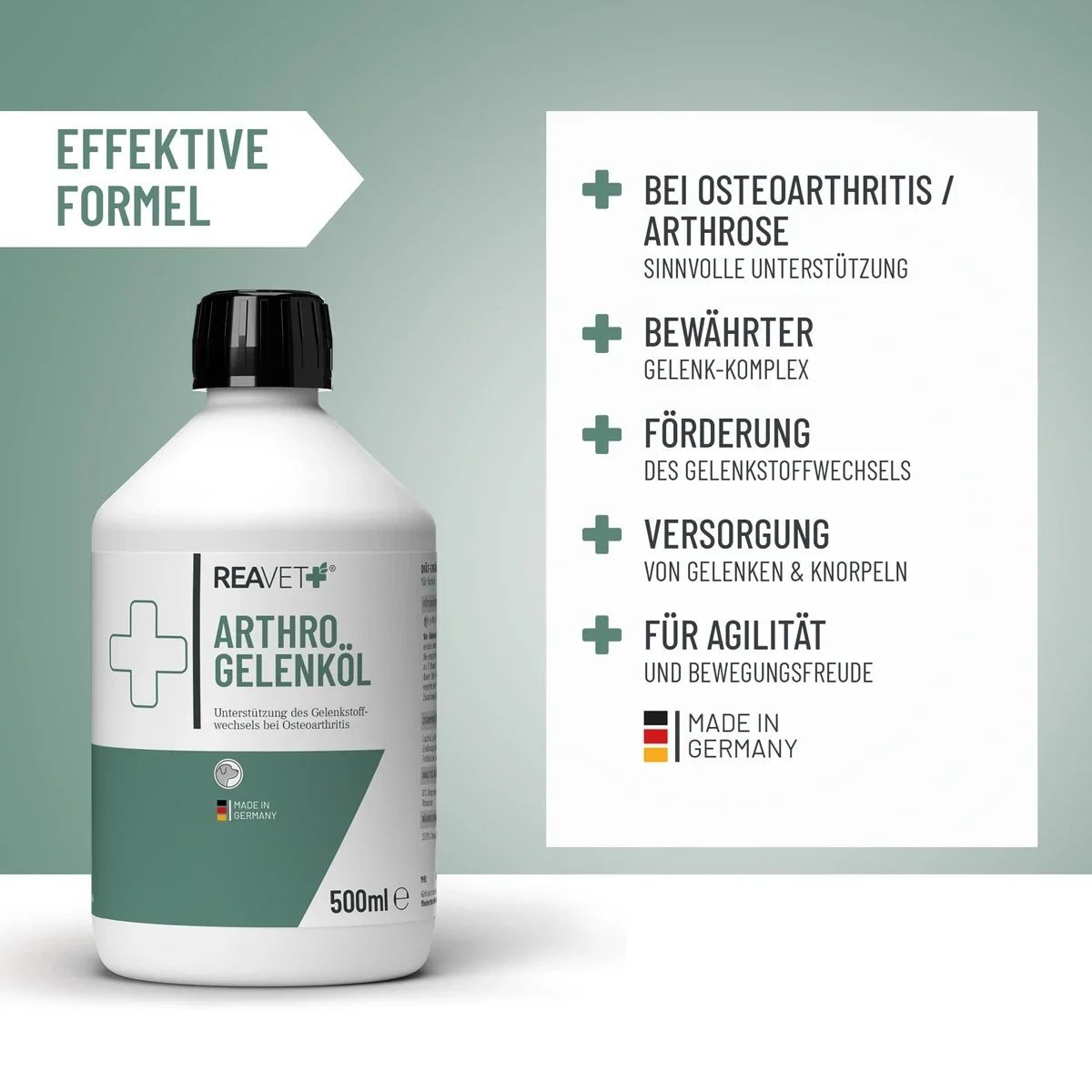 Aktiv bleiben bis ins hohe Hundealter! Mit unserem REAVET Arthro Gelenköl haben wir eine spezielle Rezeptur aus sorgfältig ausgewählten, kaltgepressten Ölen entwickelt, die die Gelenke Deines Vierbeiners unterstützen und ihm wieder mehr Freude an Bewegung schenken. Diese außergewöhnliche Mischung aus hochwertigem Lachsöl und fein aufeinander abgestimmten Pflanzenölen wie Leinöl und Hanföl ist reich an essentiellen Omega-3-Fettsäuren und sorgt für eine ausgewogene Versorgung zur Unterstützung des Gelenkstoffwechsels.
