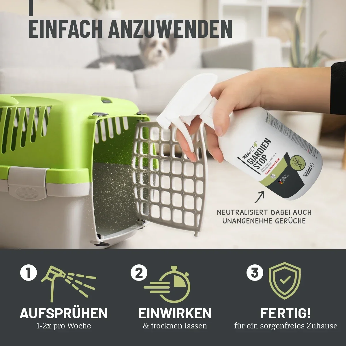 Kein Mischen, kein Aufwand. Unser Giardien Stop Spray ist sofort einsatzbereit: Einfach 1–2 Mal pro Woche auf die unmittelbare Umgebung Deiner Tiere sprühen. So hast Du im Handumdrehen mehr Sicherheit und Wohlbefinden für Deine Vierbeiner.