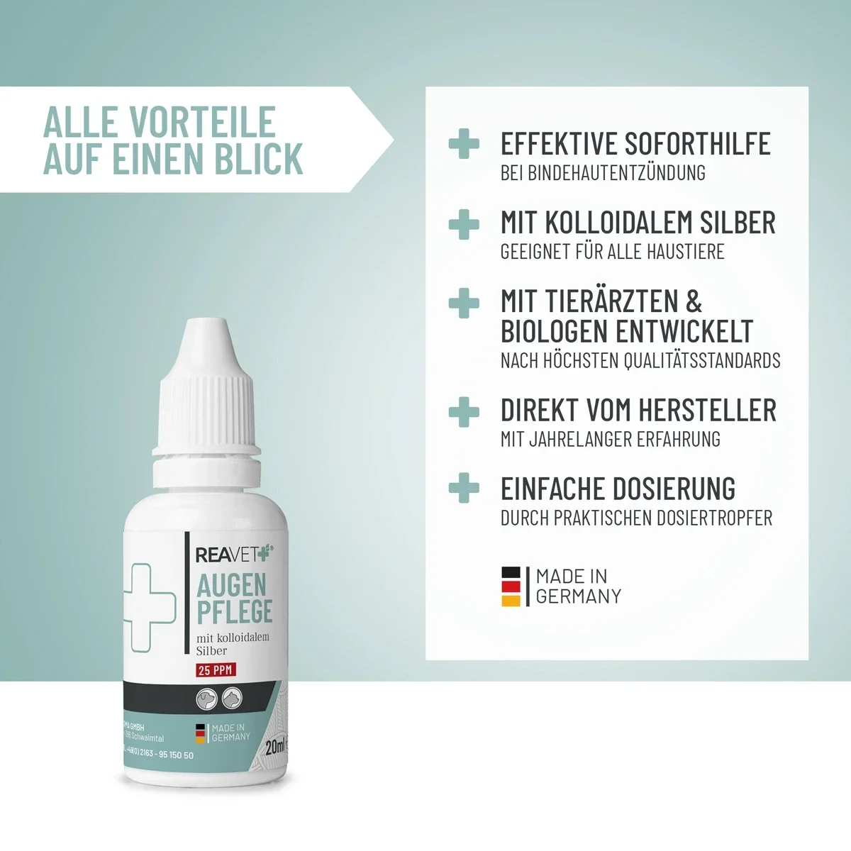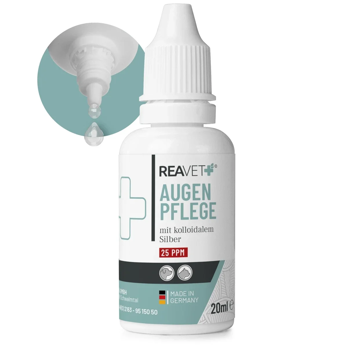 Unsere REAVET Augenpflege ist für die tägliche Reinigung und Pflege der Augen von Hunden & Katzen geeignet. Die Augentropfen sind mit 25ppm kolloidalem Silber angereichert – 99,99% Reinheit, nicht ionisch und speziell auf die empfindlichen Augen von Tieren abgestimmt. Vor allem Fremdkörper wie Staub oder Pollen können die Augen dauerhaft reizen und Augenentzündungen oder- Infektionen hervorrufen. Daher ist die Verwendung einer milden, desinfizierende Augenpflege empfehlenswert.
