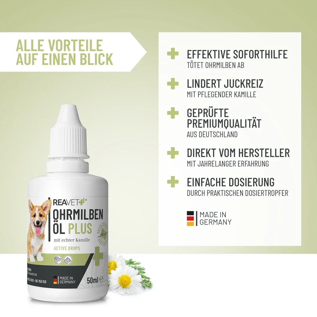 Unser REAVET Ohrmilbenöl Plus wurde speziell für Hunde entwickelt und kombiniert eine extra milde Pflegeformel mit echter Kamille – bekannt für ihre beruhigenden Eigenschaften. Die schonende Zusammensetzung eignet sich auch für empfindliche Ohren und lässt sich dank des praktischen Tropf- und Spritzverschlusses besonders leicht und stressfrei anwenden.