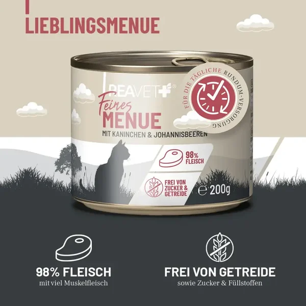 Unsere REAVET Feinen Menues bieten Deinem Stubentiger 100 % Genuss und eine ausgewogene Ernährung. Vier leckere Sorten, speziell für anspruchsvolle Katzen entwickelt, sorgen täglich für Abwechslung und ein unvergleichliches Geschmackserlebnis.