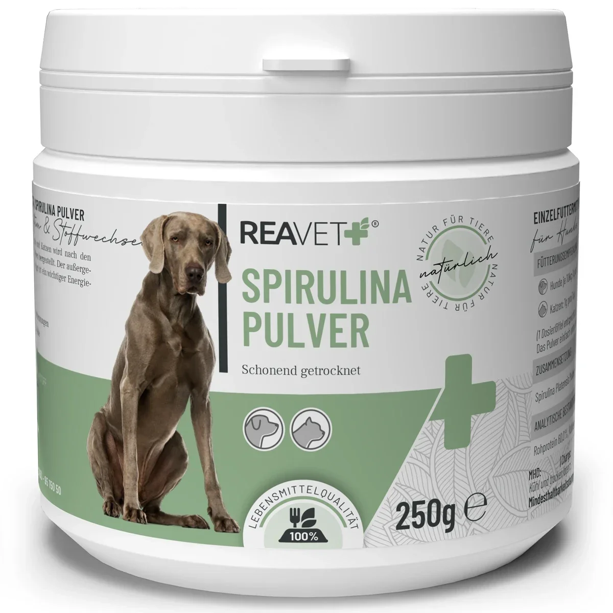 Unser REAVET Spirulina Pulver ist ein hochwertiges, schonend getrocknetes Einzelfuttermittel aus 100 % reiner Spirulina platensis. Es eignet sich ideal zur täglichen Ergänzung der Tiernahrung und unterstützt auf natürliche Weise Immunsystem und Stoffwechsel Deines Lieblings.