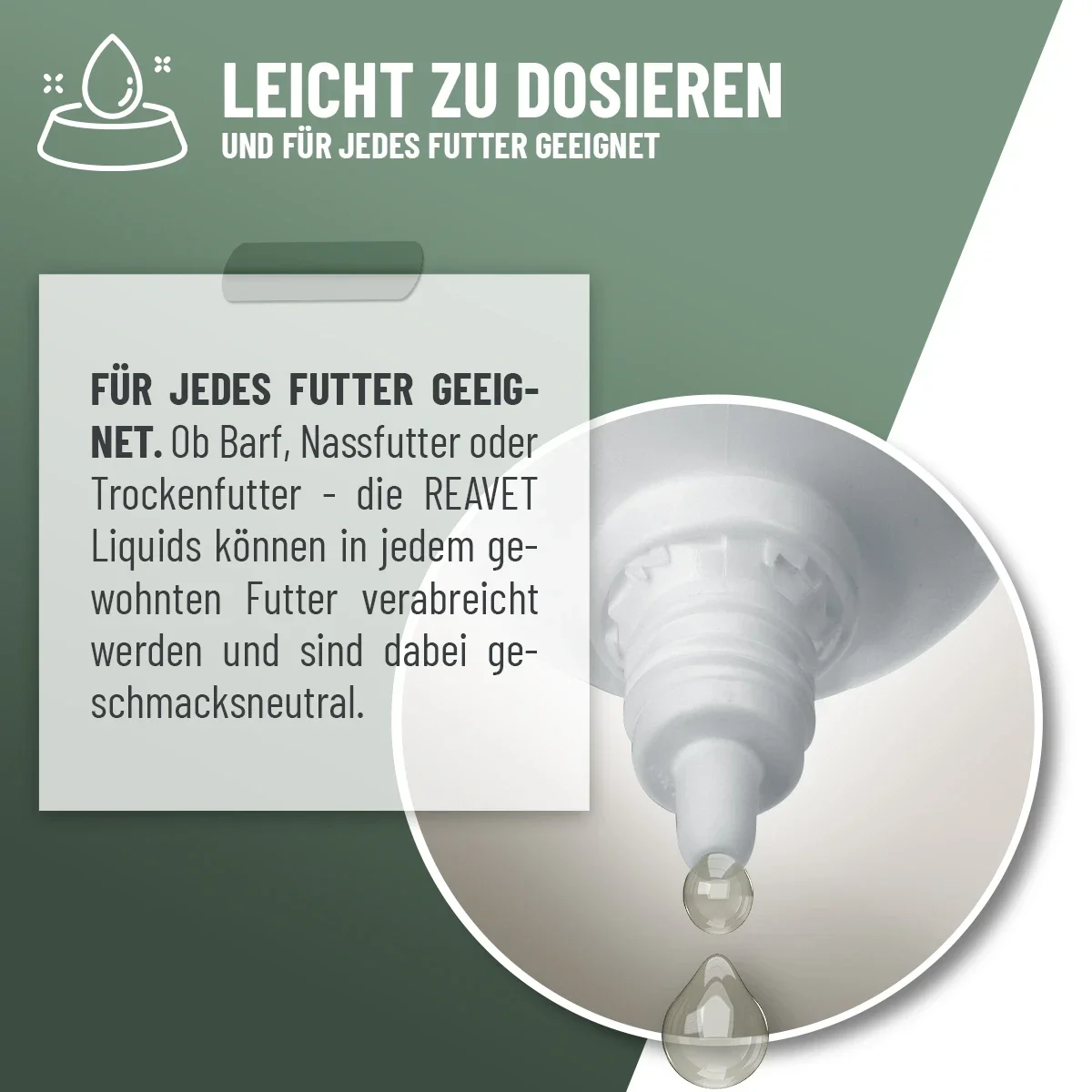REAVET Gelenk Liquid ist dank der praktischen Tropfer-Flasche leicht zu dosieren und zu verabreichen. Die speziell entwickelte Rezeptur ist besonders gut verträglich und eignet sich für jede Hunde & Katzen Rasse. Egal ob Schäferhund, Dackel oder Hauskatze, Dein Liebling erhält so ideal kombinierte Nährstoffe.