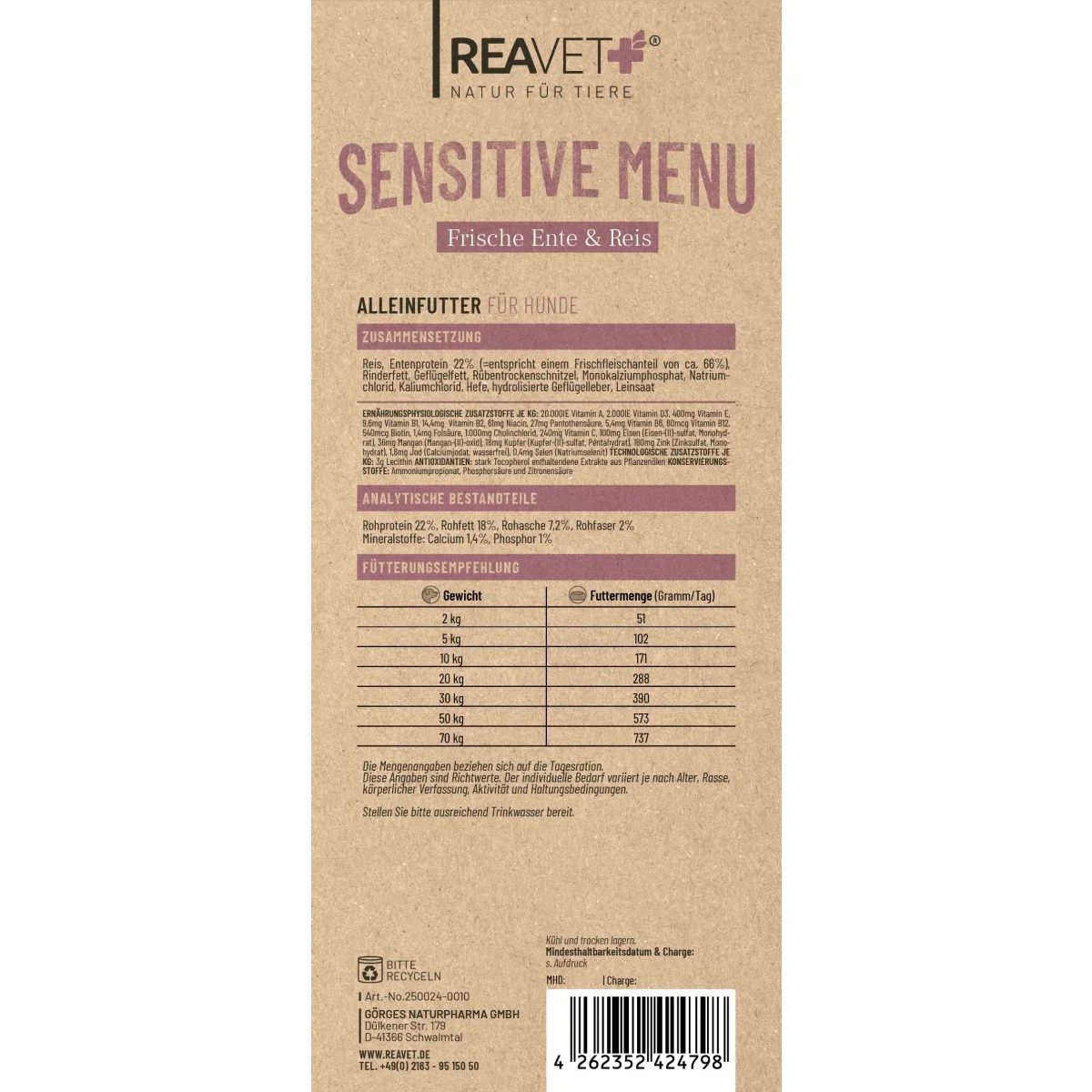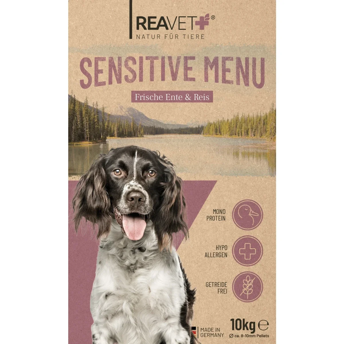 Bei Hunden kommt es immer häufiger zu Unverträglichkeiten auf bestimmte Futterkomponenten, die sich in Verdauungs-, Haut- oder Fellproblemen äußern können. Unser REAVET Sensitive Menü ist ein hochwertiges Premium Hundetrockenfutter speziell geeignet für alle Fellnasen mit empfindlichem Magen-Darm-Trakt. Unser Hundefutter Sensitive kombiniert Ente als einzige tierische proteinquelle und leicht verdaulichen Reis, wodurch das Risiko von Nahrungsmittel-Unverträglichkeiten und Allergien minimiert wird. Die im Futter enthaltene Ente, ist eine leicht verdauliche Proteinquelle. Der Hundemagen kann sich so auf die Verdauung der alleinigen Proteinquelle konzentrieren. REAVET Sensitive Menü enthält einen hohen Reis-Anteil mit geringem Allergenen Potential und wird somit ohne glutenhaltiges Getreide hergestellt.