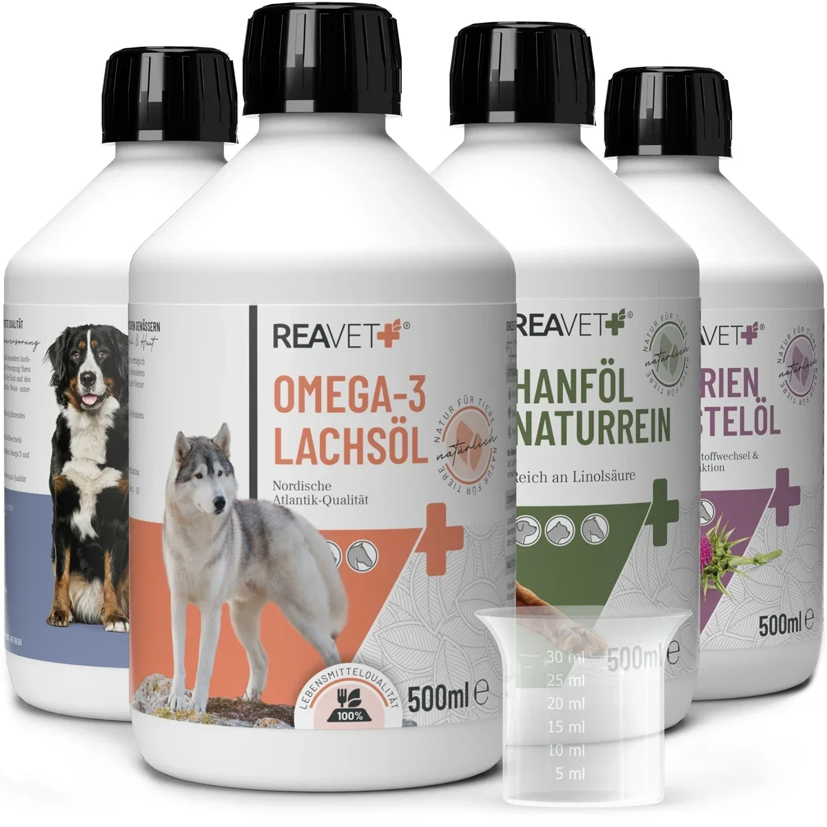 REAVET Barf Öl im 4er Set verhilft diversen Vitaminen und Mineralstoffen aus Futterquellen da anzukommen, wo sie gebraucht werden. Die Öle dienen als Unterstützung bei der Verwertung der aufgenommenen Nahrung und bieten zusätzlich auch selbst wertvolle Nährstoffe.