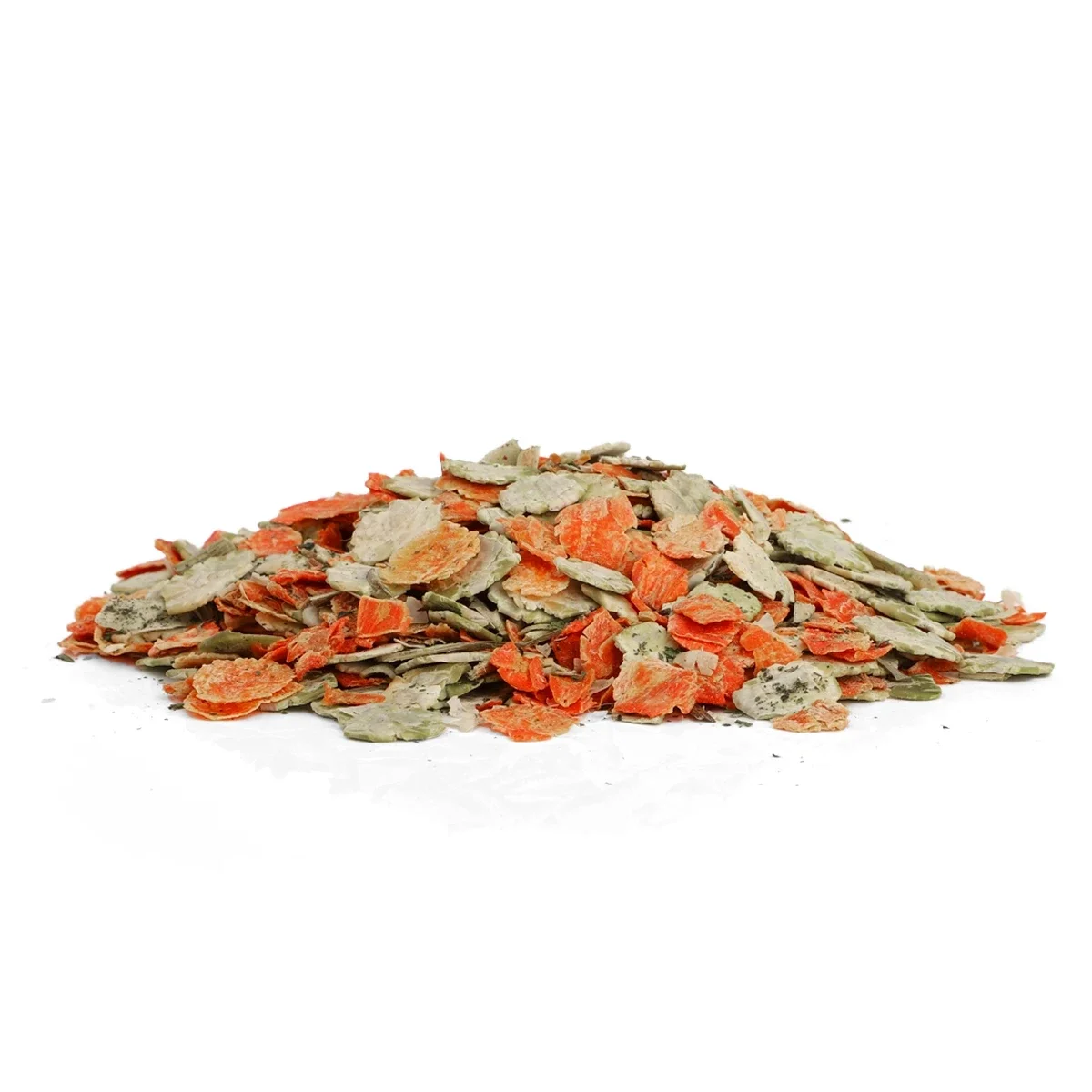 Erbsenflocken, Möhrenflocken, Luzerne Pellets, Kräutermischung (Ingwerwurzel geschnitten, Kümmel ganz, Bockshornkleesaat ganz, Fenchel süß, Hagebuttenfrüchte geschnitten, Mariendistelkraut geschnitten, Rosmarinblätter geschnitten, Thymian geschnitten, Kamille feingeschnitten), Brennnesselkraut geschnitten, Petersilie gerebelt