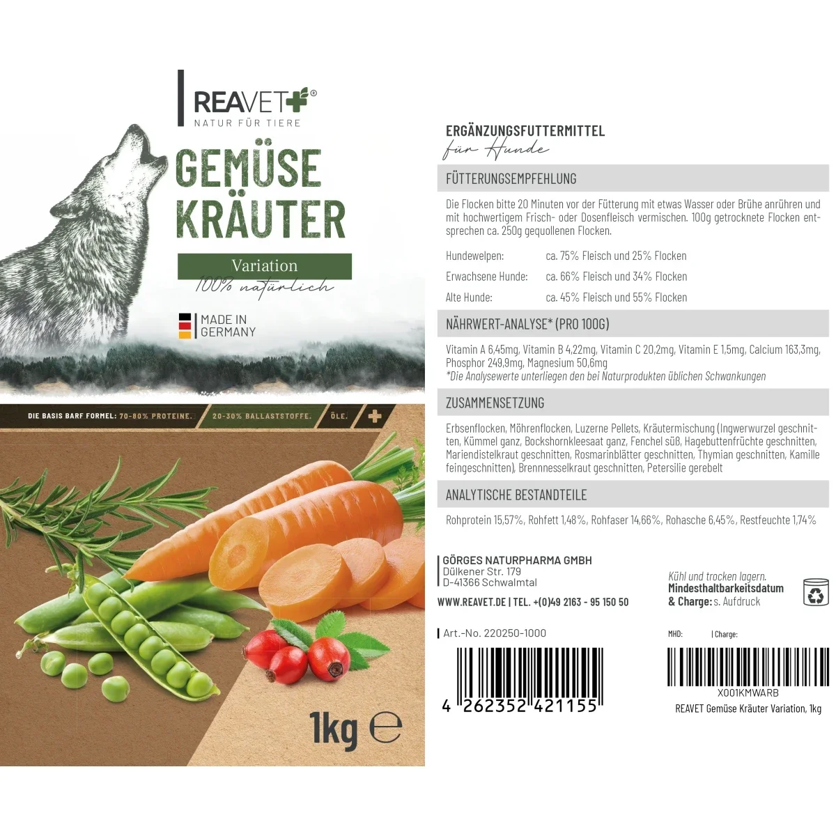 Unsere REAVET Gemüse-Kräuter Variation ist eine schonend getrocknete und getreidefreie Komposition aus hochwertigem Gemüse und feinen Kräutern, welche sich als ideale Ergänzung zum täglichen Futter eignet – nicht nur beim Barfen! Dank der schonenden Trocknung bei niedrigen Temperaturen bleiben die empfindlichen Wirkstoffe in ihrer biologischen Wirksamkeit voll erhalten.
