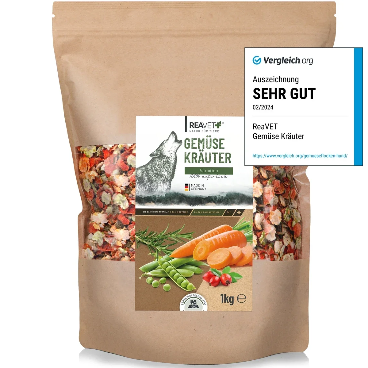 Neben dem heißgeliebten Fleisch, frischen Innereinen, knackenden Knochen & ergänzenden Supplementen sind Obst und Gemüse ein weiterer wichtiger Bestandteil eines hochwertigen BARF-Menüs. Gemüseflocken sind eine bewährte Ergänzung zu einer vollwertigen Rohfleisch Fütterung und bieten Deiner Fellnase alle wichtigen Vitamine und Mineralstoffe, die es für den täglichen Bedarf benötigt.