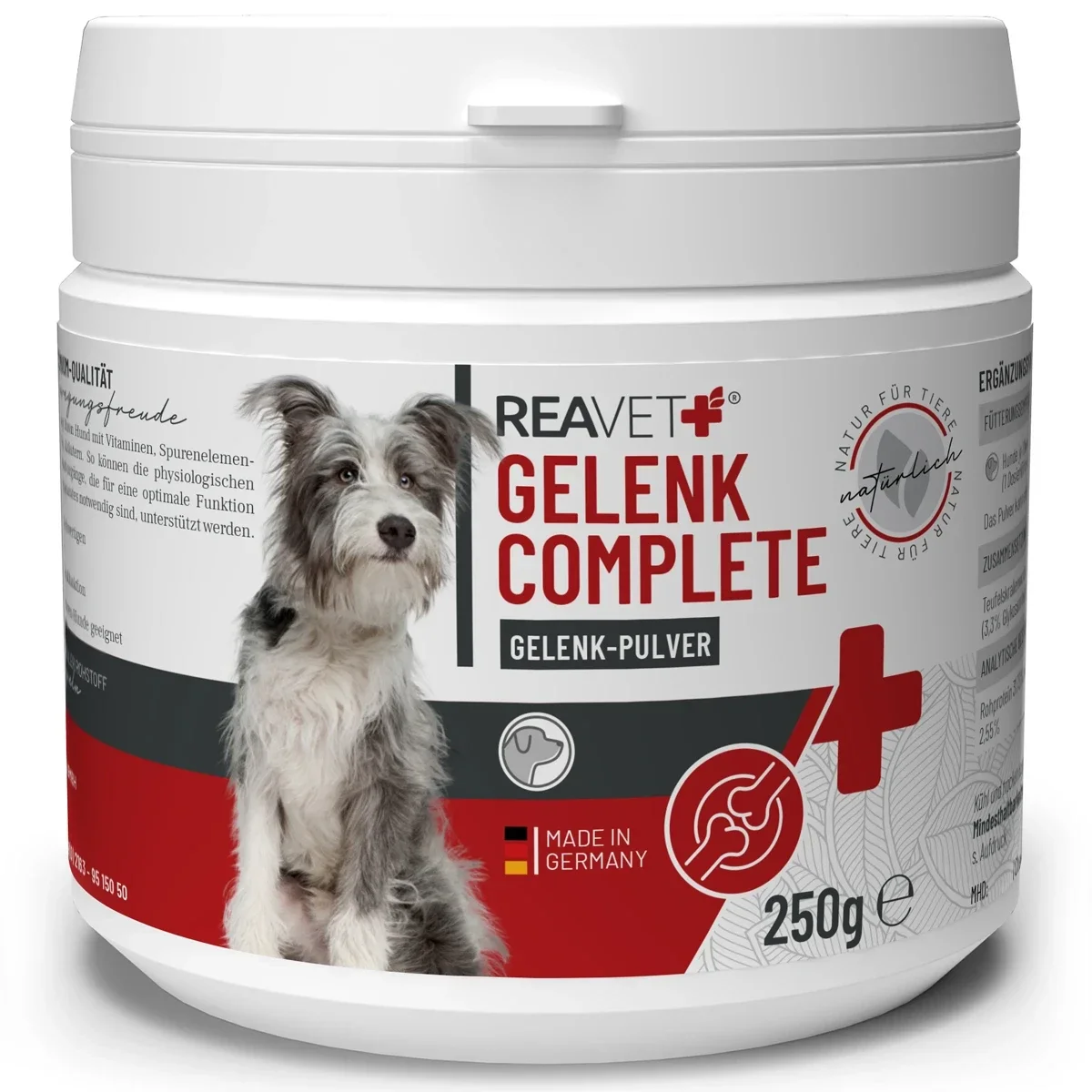 REAVET Gelenk Complete für Hunde unterstützt die physiologischen Organfunktionen und Stoffwechselvorgänge, die für eine optimale Funktion der Gelenke und des Bewegungsapparates Deines Hundes notwendig sind. Besonders bei alten Tieren nehmen Gelenkerkrankungen wie Arthrose, Arthritis und Lahmheit zu und hemmen die Lebensqualität und die Vitalität der Vierbeiner.