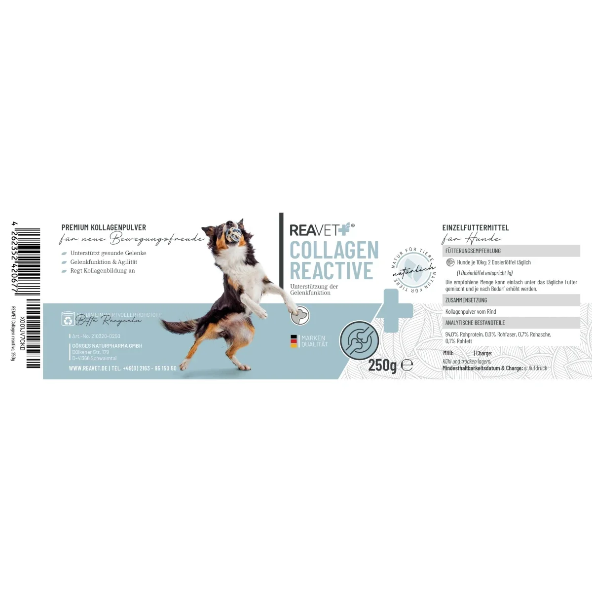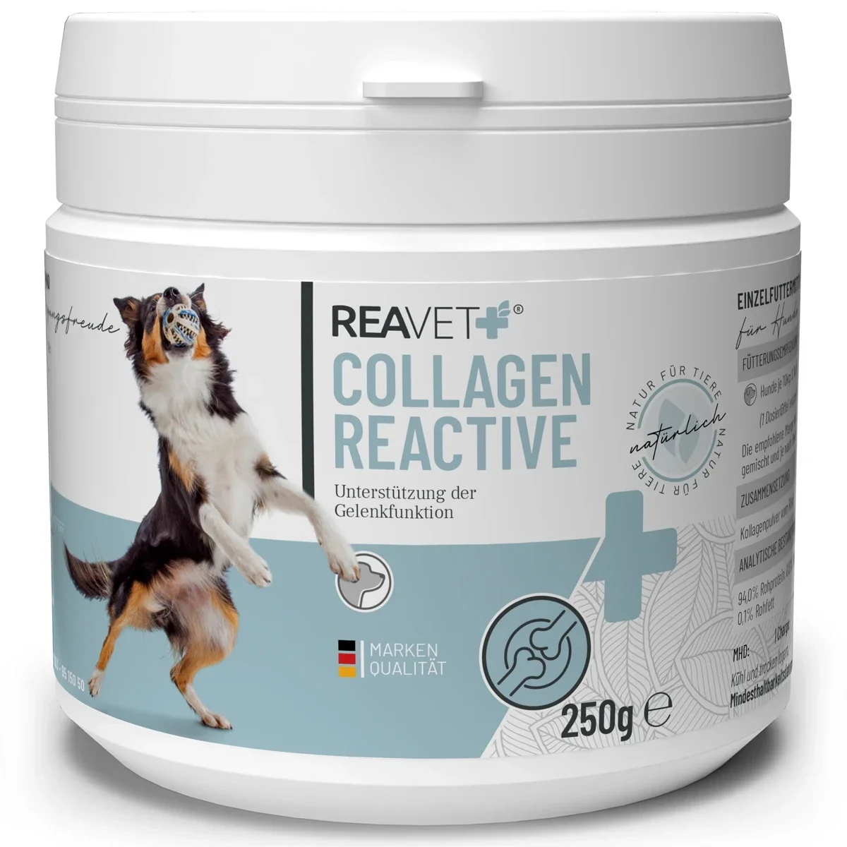 Unser REAVET Collagen Reactive ist ein hochwertiges Einzelfuttermittel für Hunde, das aus reinem Kollagenpulver besteht. Kollagen ist ein natürliches Strukturprotein und in verschiedenen Geweben wie Haut, Sehnen und Bändern enthalten.