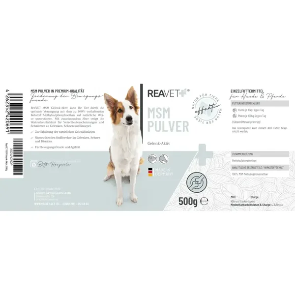 Mit unserem REAVET MSM Gelenk-Aktiv Pulver erhältst du ein hochwertiges Einzelfuttermittel, das gezielt die normale Gelenkfunktion Deines Hundes oder Pferdes unterstützt. Es enthält 100 % reines Methylsulphonylmethan (MSM) in geprüfter Premiumqualität – eine natürliche Schwefelverbindung, die sich besonders durch ihre Reinheit und Bioverfügbarkeit auszeichnet.