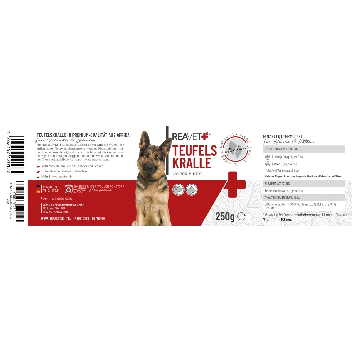 Mit unserem REAVET Teufelskralle Pulver bietest du deinem Vierbeiner eine naturbelassene Futterergänzung – ganz ohne Kompromisse.