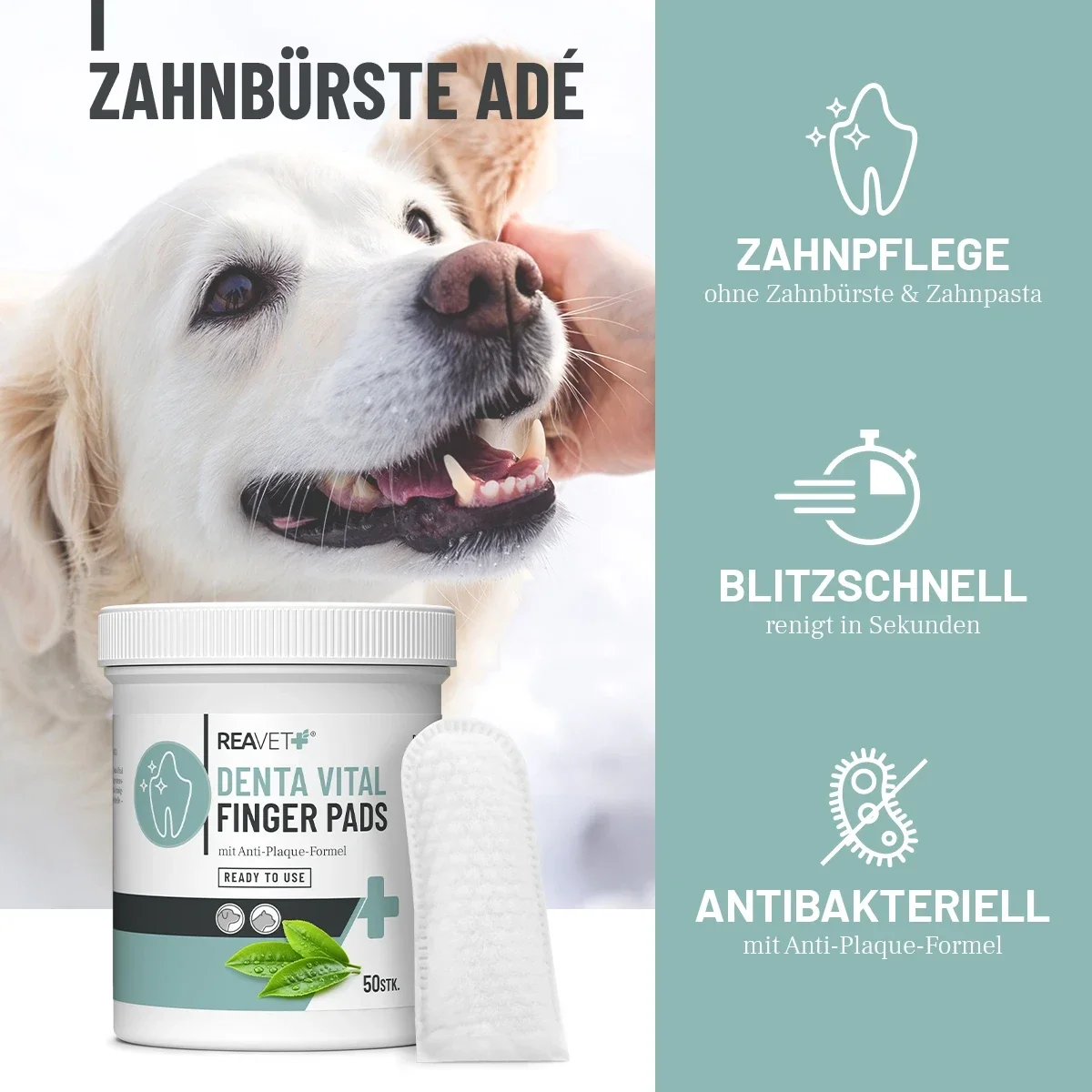 Vergiss die Zahnbürste – mit unseren REAVET Denta Vital Finger-Pads wird die Zahnpflege Deiner Fellnase stressfrei und blitzschnell. Die praktischen Einweg-Fingerpads ermöglichen eine effektive Reinigung in Sekundenschnelle. Einfach über den Finger gestreift – die Zahnpflege gelingt ohne Bürste oder Zahnpasta im Handumdrehen.