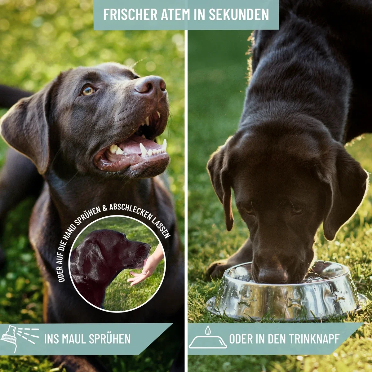 Täglich 1 - 2 Sprühstöße ins Maul Deines Hundes sprühen oder einfach in den Trinknapf geben.