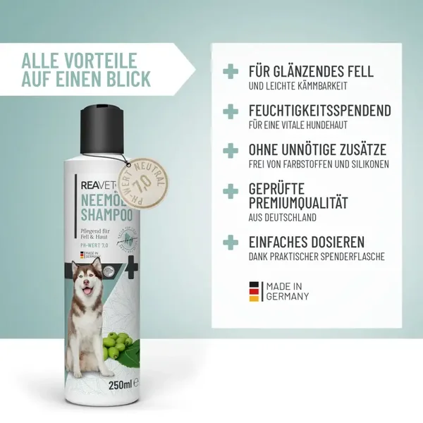 Verwöhne Deinen Vierbeiner mit dem hautfreundlichen und angenehm duftenden REAVET Neemöl Shampoo! Die einzigartige Formel mit kaltgepresstem Neemöl und Neemextrakt pflegt intensiv, spendet Feuchtigkeit und sorgt für ein geschmeidiges, leicht kämmbares Fell.