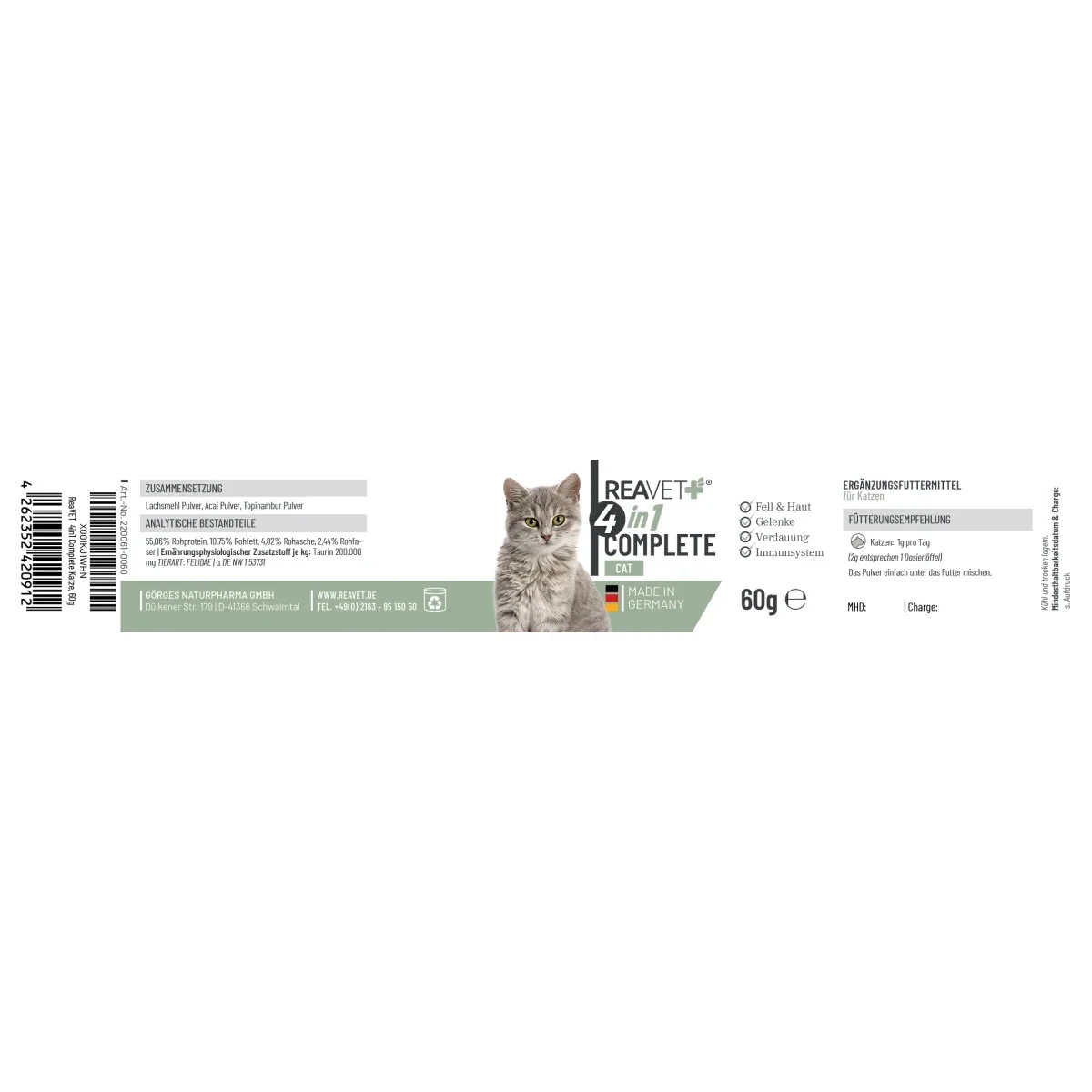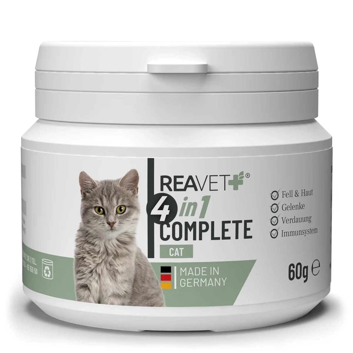 Unser REAVET 4in1 Complete Cat ist ein hochwertiges Ergänzungsfuttermittel, das speziell für Katzen aller Altersstufen und Lebensphasen entwickelt wurde. Die erlesene Rezeptur vereint vier wirkungsvolle Komponenten, die Deine Katze optimal mit wichtigen Nährstoffen versorgen – für mehr Vitalität, Wohlbefinden und ein glückliches Katzenleben.