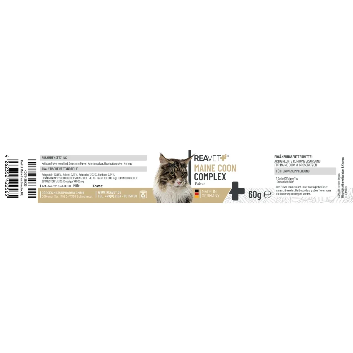 Maine Coons zeichnen sich durch ihre Größe, ihren kräftigen Körperbau und ihr dichtes Fell aus – all das stellt besondere Anforderungen an Stoffwechsel, Haut, Fell und Gelenke. REAVET Maine Coon Complex liefert ausgewählte Nährstoffe und Vitalstoffe, die den Organismus Deiner Katze in diesen Bereichen gezielt unterstützen. So bleibt Deine Maine Coon rundum vital, aktiv und in Balance.