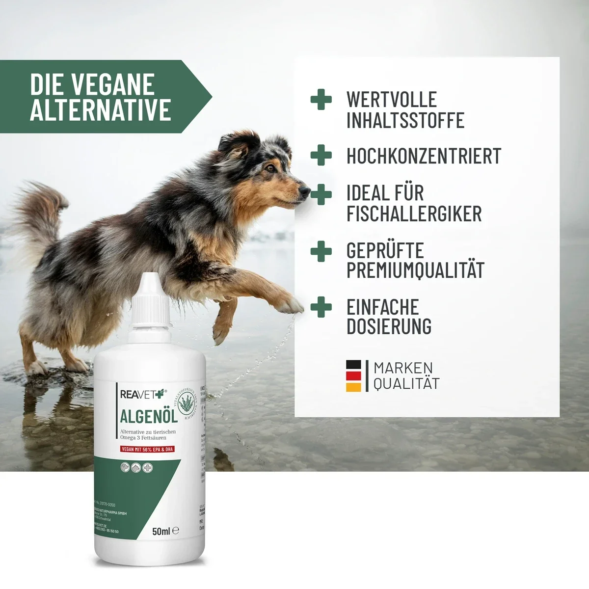 Unser REAVET Algenöl ist die ideale Lösung für Tiere mit Fischallergien oder Unverträglichkeiten. Es wird aus der Meeresalge Schizochytrium sp. gewonnen und ist besonders reich an wertvollen Omega-3-Fettsäuren, die die Haut- und Fellgesundheit unterstützen können und das allgemeine Wohlbefinden fördern.