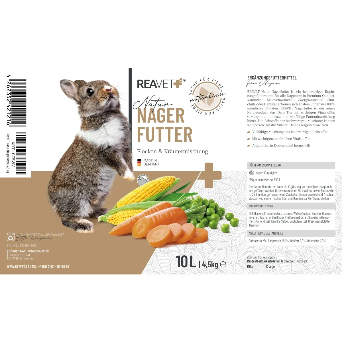 REAVET Natur Nagerfutter ist ein hochwertiges Ergänzungsfuttermittel für alle Nagetiere in Premium Qualität. Kaninchen, Meerschweinchen, Zwergkaninchen, Chinchilla oder Hamster erfreuen Sich an dem Futter aus 100 % aus natürlichen Zutaten. Das Nagerfutter ist ein reines Naturprodukt, das Dein Tier durch eine vielfältige Mischung aus verschiedenen Gemüseflocken, Getreide, Luzerne und Kräutern – inkl. eines hohen Anteils an Löwenzahn – mit wichtigen Nährstoffen versorgt und ihm dazu eine gesunde Futterabwechslung bietet. Die Rohstoffe der hochwertigen Mischung können sich positiv auf die Gesunderhaltung Deines Nagers auswirken.