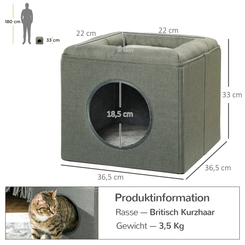 - Produktdaten des Hundehauses: Gesamtabmessungen: 36,5L x 36,5B x 33H cm - Abmessungen des Kissens: 36L x 36B cm - Geeignet für eine Katze unter 5 kg