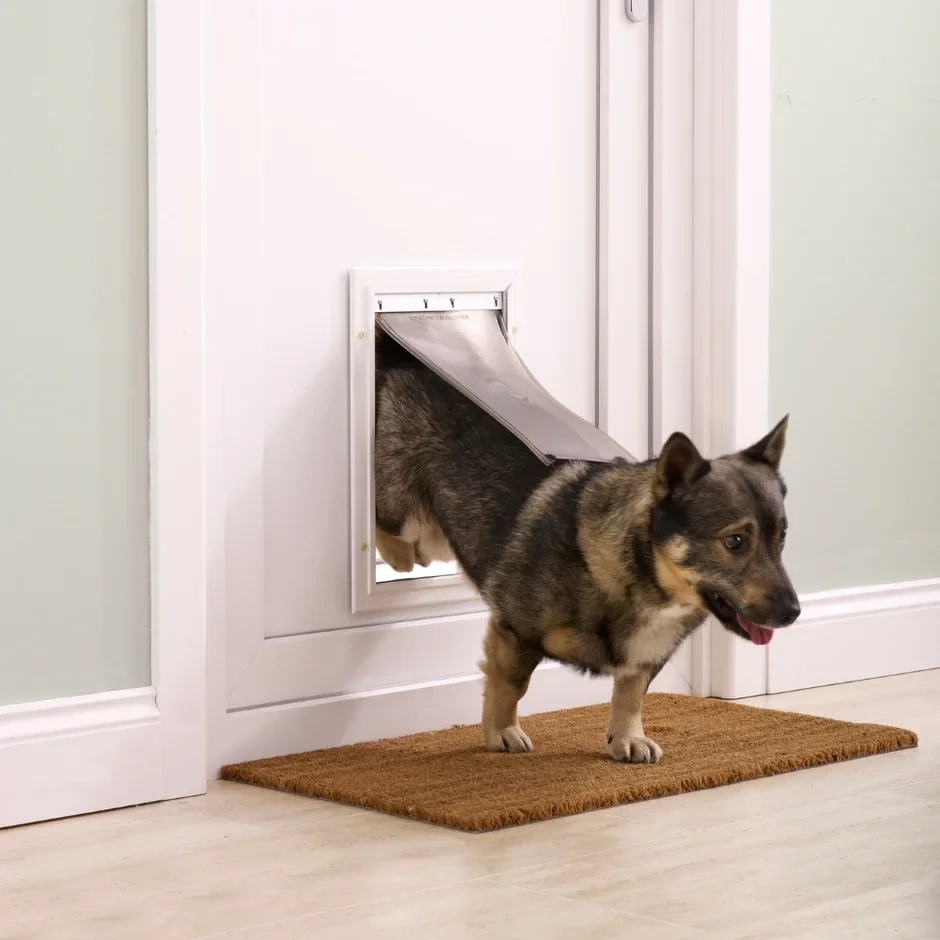 Diese Tür gibt Ihrem Haustier die nötige Unabhängigkeit. Der robuste Aluminiumrahmen ist einfach zu montieren und verfügt über verstärkte Ecken für Haushalte mit mehreren Haustieren. Die flexible, weiche Klappe ist getönt und verstellbar. Ein magnetischer Klappenverschluss und seitliche Dichtungsstreifen sorgen für wetterfeste Abdichtung. Eine Verriegelungsplatte sorgt für zusätzlichen Wetterschutz oder kontrolliert den Zugang Ihres Haustieres zur Haustiertür. Die Montage dieser Katzen- und Hundetür ist ein einfaches Heimwerkerprojekt und passt für Türen mit einer Dicke von bis zu 51 mm.