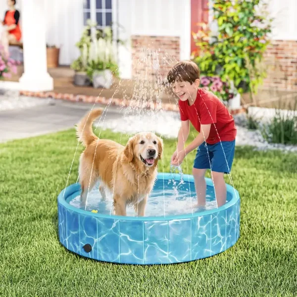 - Kühle, erfrischende Spritzzone: Erleben Sie unvergessliche Sommerabenteuer mit einer eingebauten Wassermatte des Hunde-Pools, die durch zahlreiche Löcher einen unterhaltsamen und kühlenden Wasserfluss an heißen Tagen bietet.
