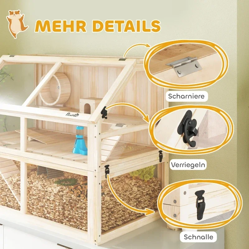 - Modernes Design und Vielseitigkeit: Dezentes Naturholz, klare Linien und großzügige Maße des Nagariums passen stilvoll ins Zuhause und sind ideal für Zwerg- und kleine Mittelhamster geeignet – für ein harmonisches Miteinander im Alltag. Produktabmessungen: 95B x 53T x 76H cm. Zerlegbar, Montage erforderlich.